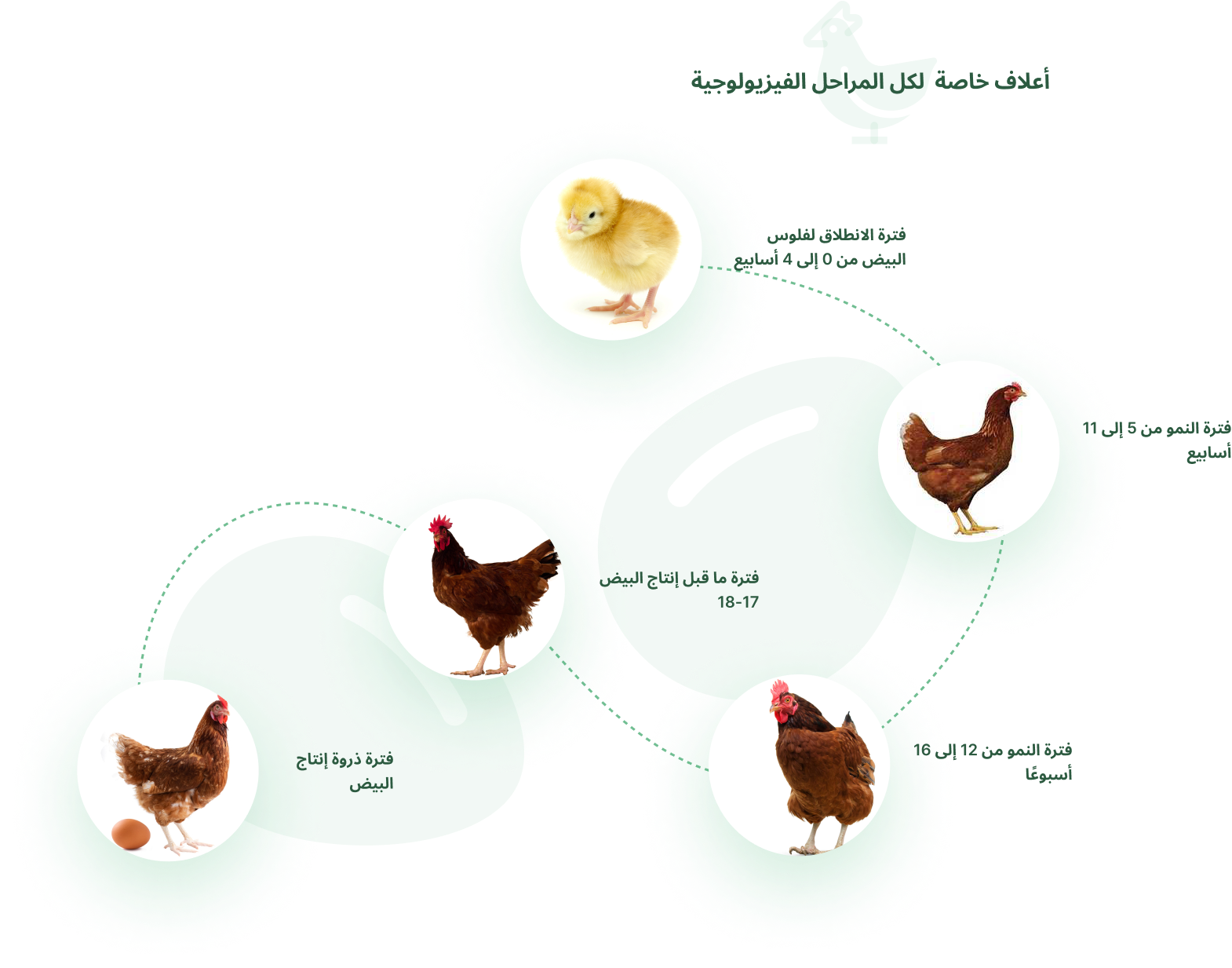 يجب توزيع هذا العلف خلال الأسابيع 17 و 18 من العمر للتحضير الأفضل لبدء إنتاج البيض .